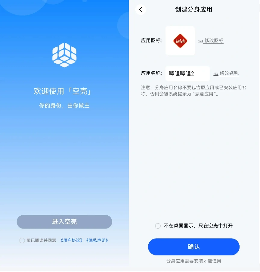 一款兼容Android 9.0至14.0系统的应用,它清爽无犷告,免费可用。软件界面简洁,主页清晰地显示了已经添加的分身。你只需点击右上角,即可选择手机上的软件来分身。空壳的特别之处在于,当创建分身软件时,它会生成一个独立的软件安装包,需要安装到手机系统中。这个安装包的名字可以自定义,软件包名和版本都与原软件不同,因此安装到手机上后,可以与原软件共存。