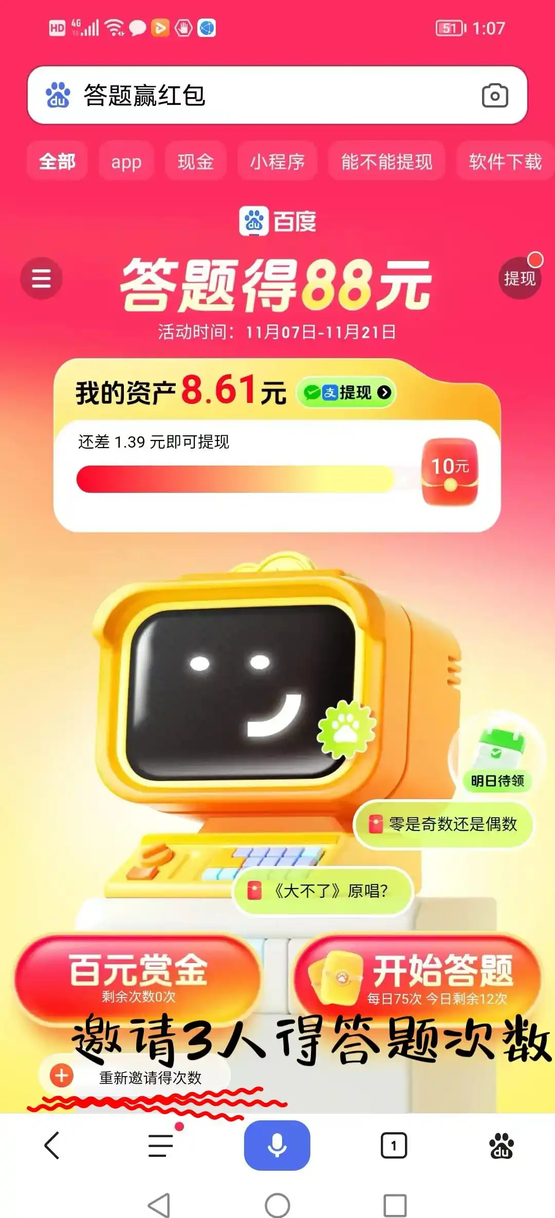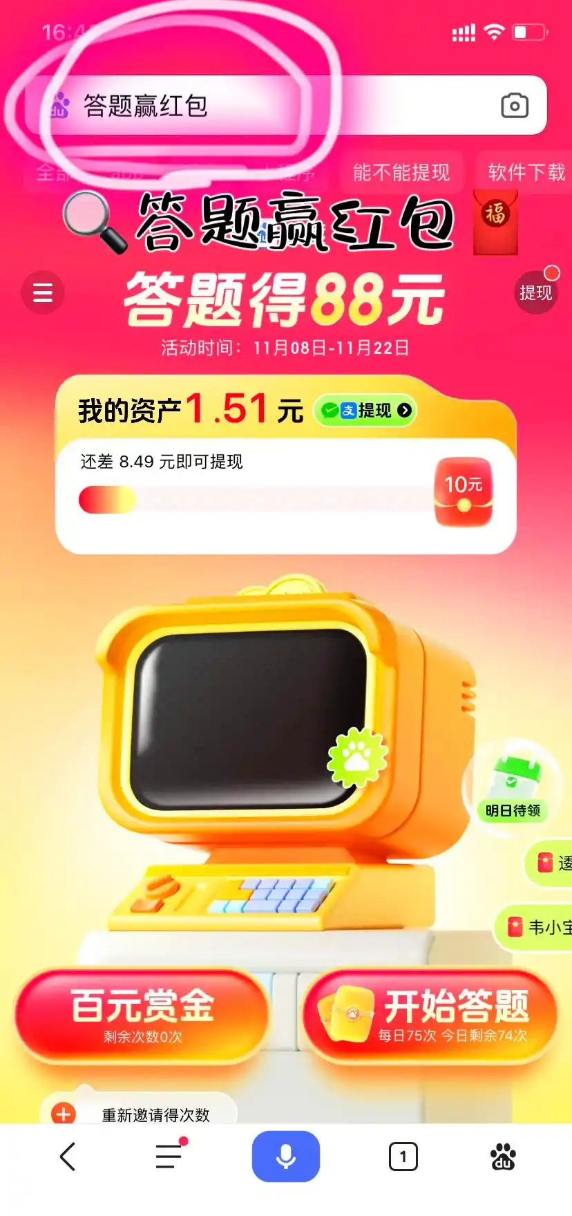这是百度最近推出的小游戏活动,参与答题活动,答题获得20就可提现到微信或支付宝如果想多答题,最高可以拿到88块。百度为了做推广,基本上算是送钱了,只是需要花用户一些答题时间。