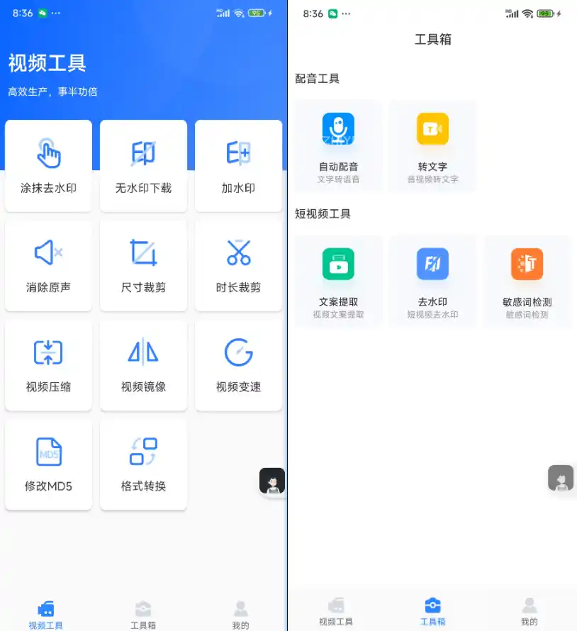 - 功能齐全,涵盖有去水印、加水印、无水印下载、消除原声、尺寸裁剪、时长裁剪、视频压缩、视频镜像、视频变速、格式转换等