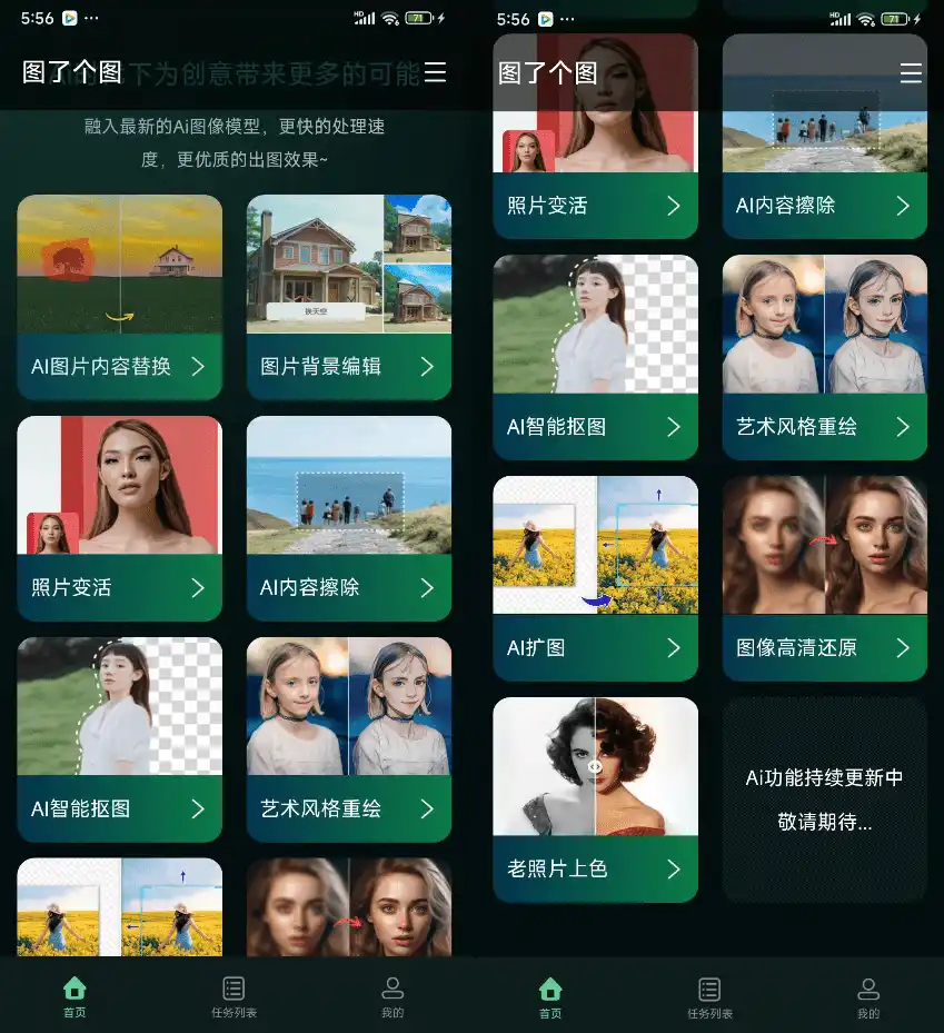 - 内置了很多图像相关的Ai功能,如AI重绘、内容替换、照片变活、AI内容擦除、AI抠图、艺术风格重塑、AI扩图、图像高清还原和老照片上色等
