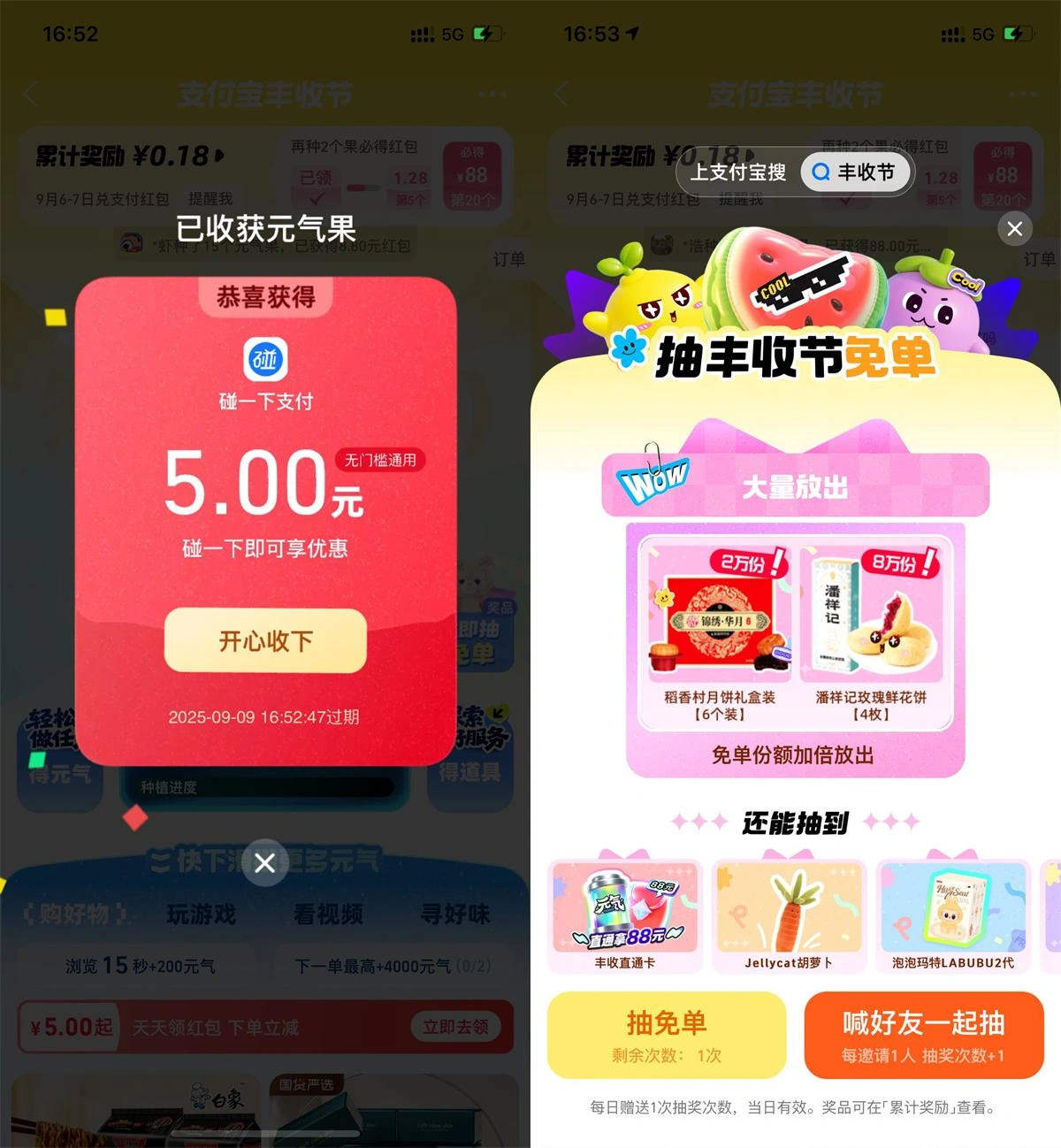 - 支付宝搜索“丰收节”->每天浏览得元气,升级抽红包等奖励->右侧还可以抽实物免单